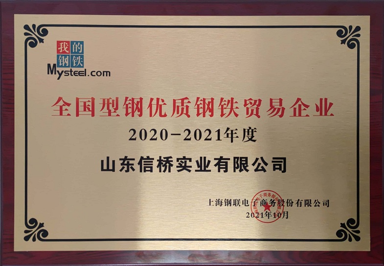 山東信橋?qū)崢I(yè)有限公司獲全國(guó)型鋼優(yōu)質(zhì)鋼鐵貿(mào)易企業(yè)(2020-2021年度)